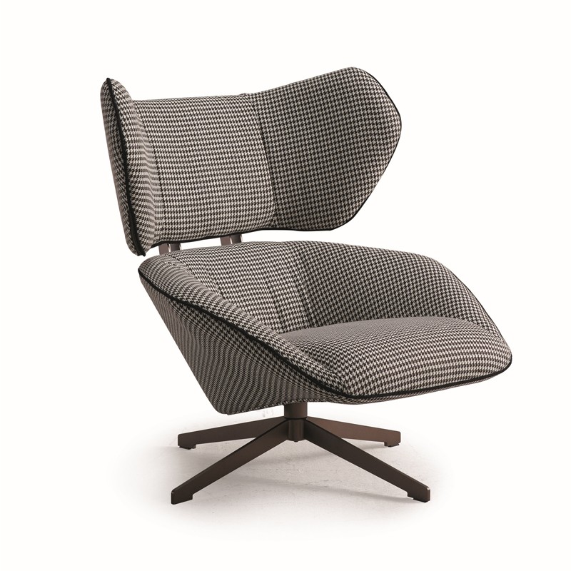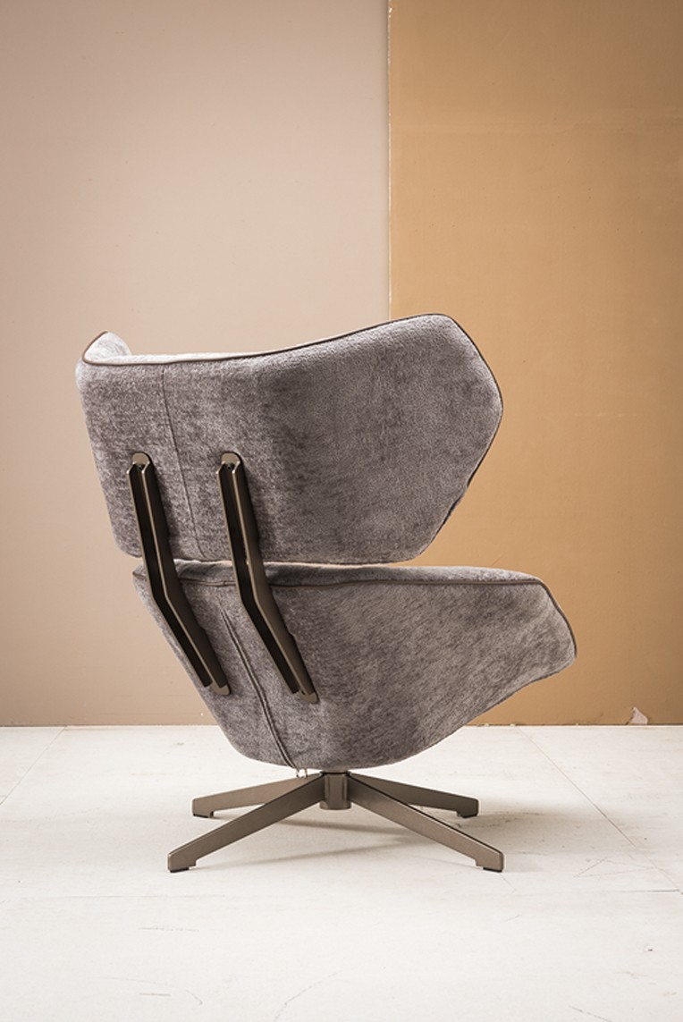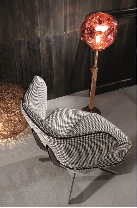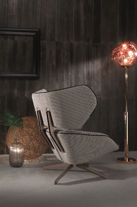 L' Antonio est un fauteuil élégant et moderne avec une couverture en tissu et un pied métallique pivotant.